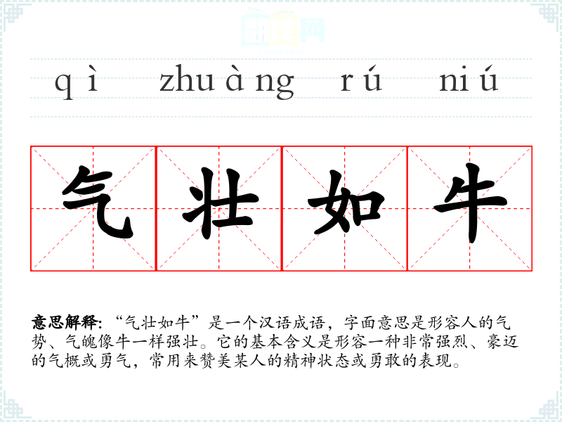“气壮如牛”是一个汉语成语,字面意思是形容人的气势、气魄像牛一样强壮。它的基本含义是形容一种非常强烈、豪迈的气概或勇气,常用来赞美某人的精神状态或勇敢的表现。