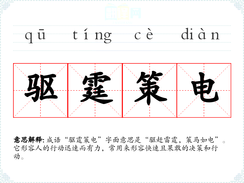 成语“驱霆策电”字面意思是“驱赶雷霆,策马如电”。它形容人的行动迅速而有力,常用来形容快速且果敢的决策和行动。