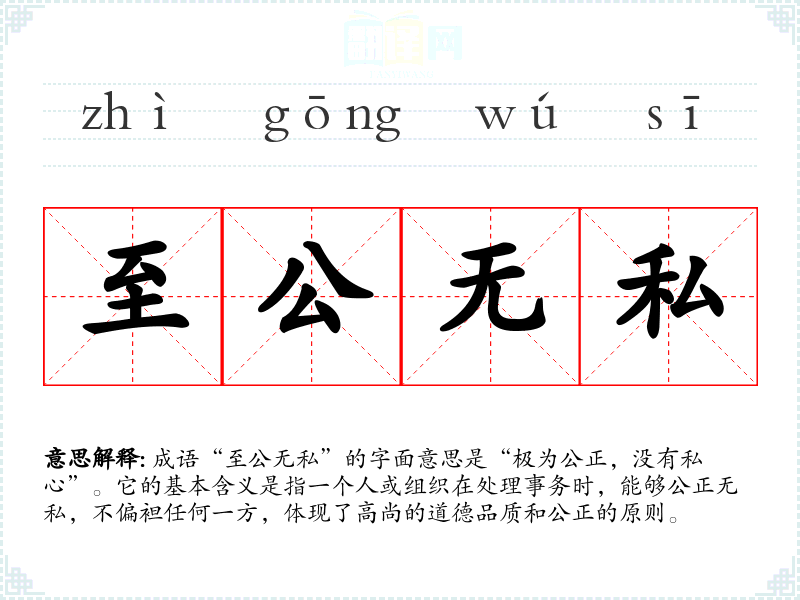 成语“至公无私”的字面意思是“极为公正,没有私心”。它的基本含义是指一个人或组织在处理事务时,能够公正无私,不偏袒任何一方,体现了高尚的道德品质和公正的原则。