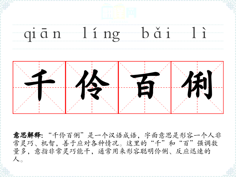 “千伶百俐”是一个汉语成语,字面意思是形容一个人非常灵巧、机智,善于应对各种情况。这里的“千”和“百”强调数量多,意指非常灵巧能干,通常用来形容聪明伶俐、反应迅速的人。