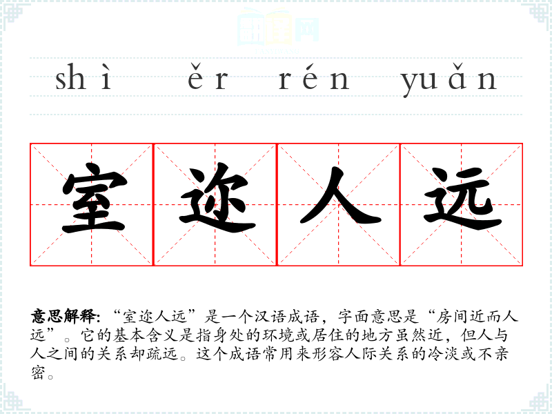 | 人遐室迩 | 室:房屋;迩:近。房屋就在近处,可是房屋的主人却离得远了。多用于思念远别的人或悼念死者。 |