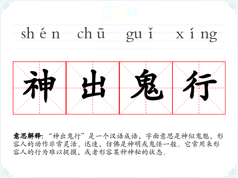 “神出鬼行”是一个汉语成语,字面意思是神似鬼魅,形容人的动作非常灵活、迅速,仿佛是神明或鬼怪一般。它常用来形容人的行为难以捉摸,或者形容某种神秘的状态。