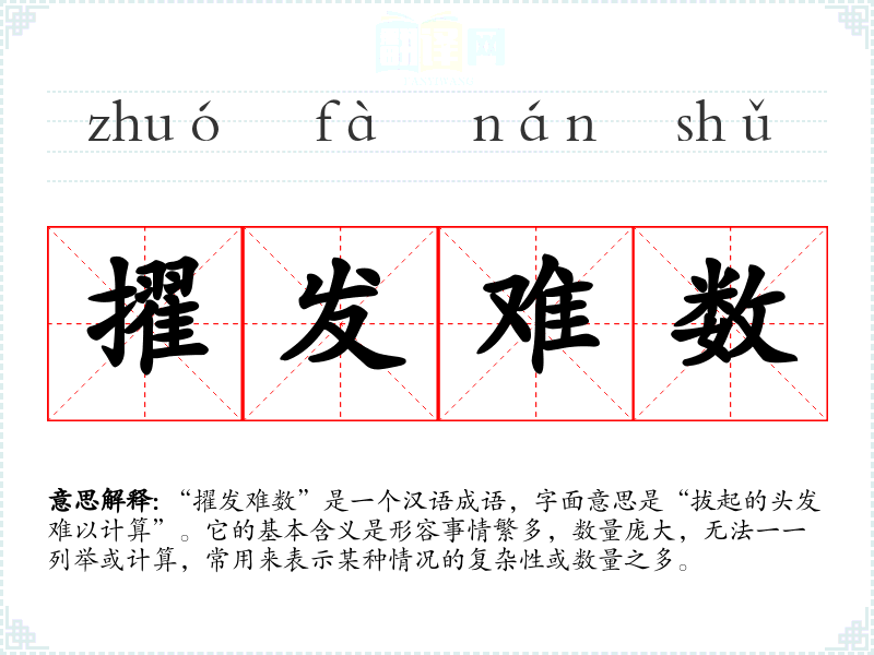 “擢发难数”是一个汉语成语,字面意思是“拔起的头发难以计算”。它的基本含义是形容事情繁多,数量庞大,无法一一列举或计算,常用来表示某种情况的复杂性或数量之多。