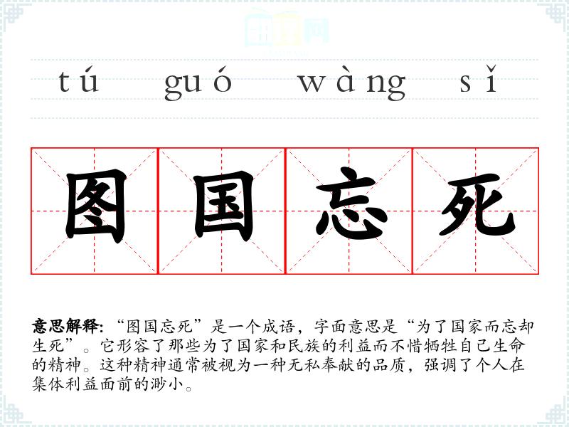 “图国忘死”是一个成语,字面意思是“为了国家而忘却生死”。它形容了那些为了国家和民族的利益而不惜牺牲自己生命的精神。这种精神通常被视为一种无私奉献的品质,强调了个人在集体利益面前的渺小。