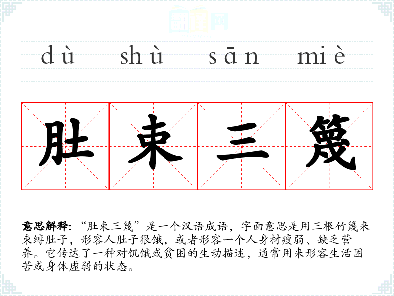 “肚束三篾”是一个汉语成语,字面意思是用三根竹篾来束缚肚子,形容人肚子很饿,或者形容一个人身材瘦弱、缺乏营养。它传达了一种对饥饿或贫困的生动描述,通常用来形容生活困苦或身体虚弱的状态。