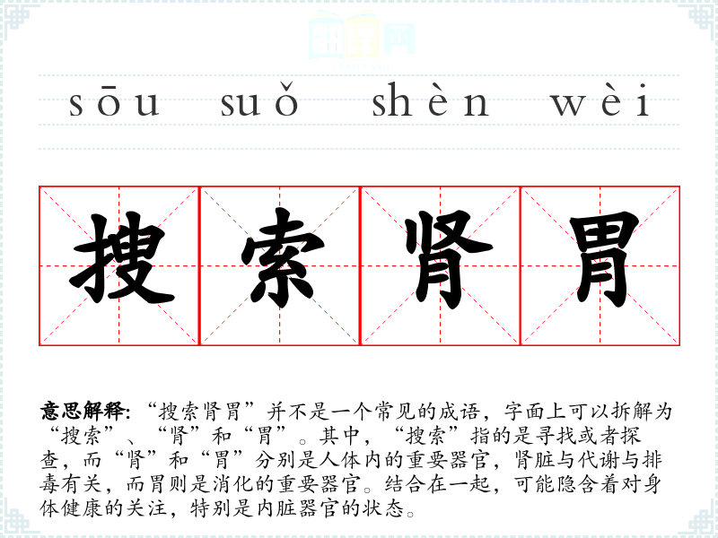 “搜索肾胃”并不是一个常见的成语,字面上可以拆解为“搜索”、“肾”和“胃”。其中,“搜索”指的是寻找或者探查,而“肾”和“胃”分别是人体内的重要器官,肾脏与代谢与排毒有关,而胃则是消化的重要器官。结合在一起,可能隐含着对身体健康的关注,特别是内脏器官的状态。