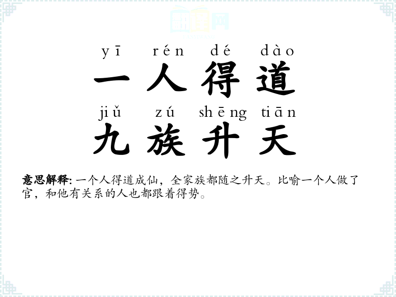 一个人得道成仙,全家族都随之升天。比喻一个人做了官,和他有关系的人也都跟着得势。 |