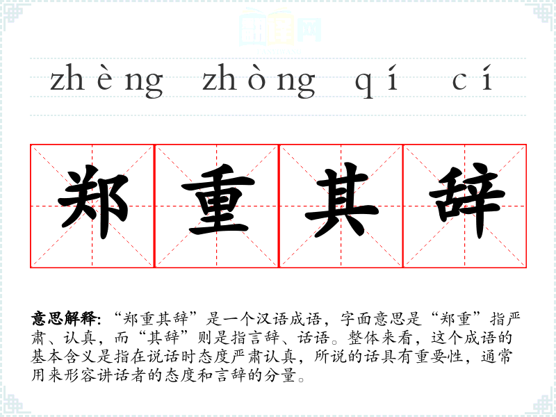 “郑重其辞”是一个汉语成语,字面意思是“郑重”指严肃、认真,而“其辞”则是指言辞、话语。整体来看,这个成语的基本含义是指在说话时态度严肃认真,所说的话具有重要性,通常用来形容讲话者的态度和言辞的分量。