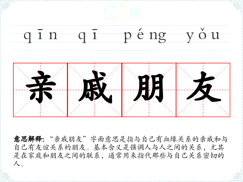 “亲戚朋友”字面意思是指与自己有血缘关系的亲戚和与自己有友谊关系的朋友。基本含义是强调人与人之间的关系,尤其是在家庭和朋友之间的联系,通常用来指代那些与自己关系密切的人。
