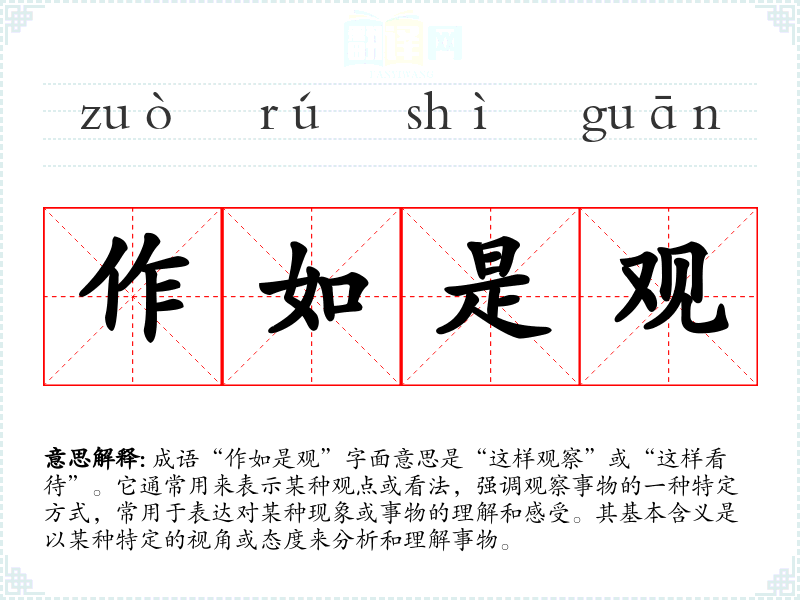 成语“作如是观”字面意思是“这样观察”或“这样看待”。它通常用来表示某种观点或看法,强调观察事物的一种特定方式,常用于表达对某种现象或事物的理解和感受。其基本含义是以某种特定的视角或态度来分析和理解事物。