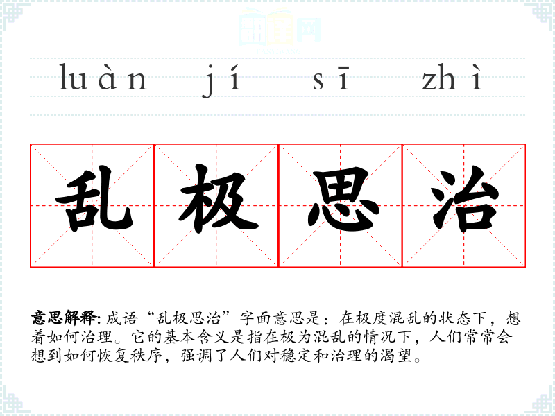 成语“乱极思治”字面意思是:在极度混乱的状态下,想着如何治理。它的基本含义是指在极为混乱的情况下,人们常常会想到如何恢复秩序,强调了人们对稳定和治理的渴望。