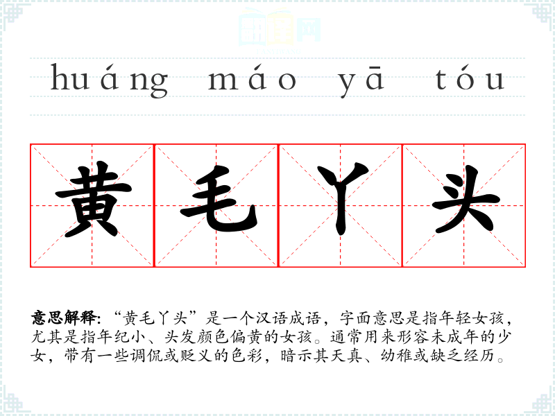 “黄毛丫头”是一个汉语成语,字面意思是指年轻女孩,尤其是指年纪小、头发颜色偏黄的女孩。通常用来形容未成年的少女,带有一些调侃或贬义的色彩,暗示其天真、幼稚或缺乏经历。