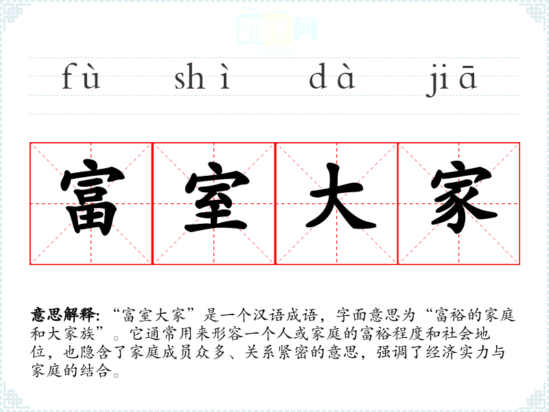 “富室大家”是一个汉语成语,字面意思为“富裕的家庭和大家族”。它通常用来形容一个人或家庭的富裕程度和社会地位,也隐含了家庭成员众多、关系紧密的意思,强调了经济实力与家庭的结合。