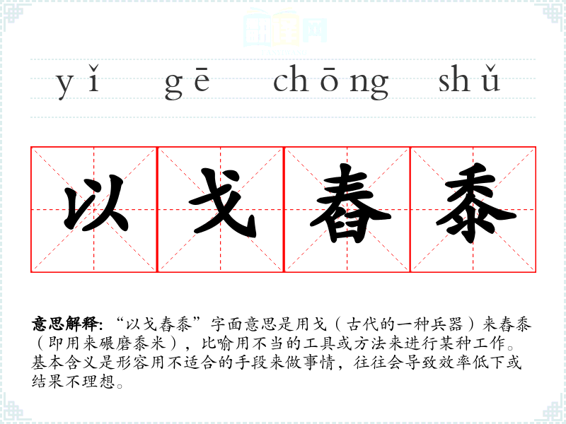 “以戈舂黍”字面意思是用戈(古代的一种兵器)来舂黍(即用来碾磨黍米),比喻用不当的工具或方法来进行某种工作。基本含义是形容用不适合的手段来做事情,往往会导致效率低下或结果不理想。