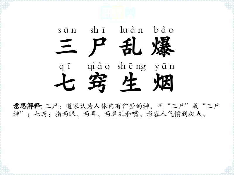 三尸:道家认为人体内有作崇的神,叫“三尸”或“三尸神”;七窍:指两眼、两耳、两鼻孔和嘴。形容人气愤到极点。 |