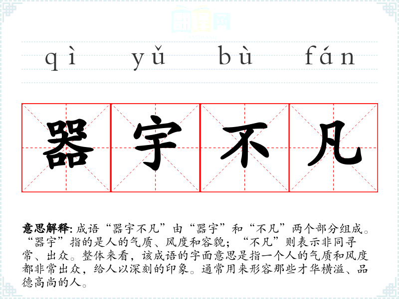 成语“器宇不凡”由“器宇”和“不凡”两个部分组成。“器宇”指的是人的气质、风度和容貌;“不凡”则表示非同寻常、出众。整体来看,该成语的字面意思是指一个人的气质和风度都非常出众,给人以深刻的印象。通常用来形容那些才华横溢、品德高尚的人。