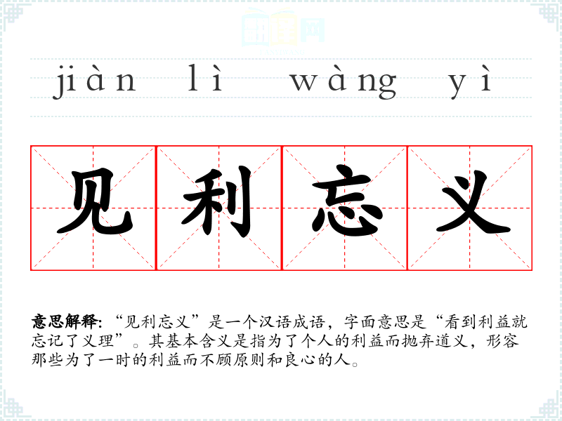 “见利忘义”是一个汉语成语,字面意思是“看到利益就忘记了义理”。其基本含义是指为了个人的利益而抛弃道义,形容那些为了一时的利益而不顾原则和良心的人。