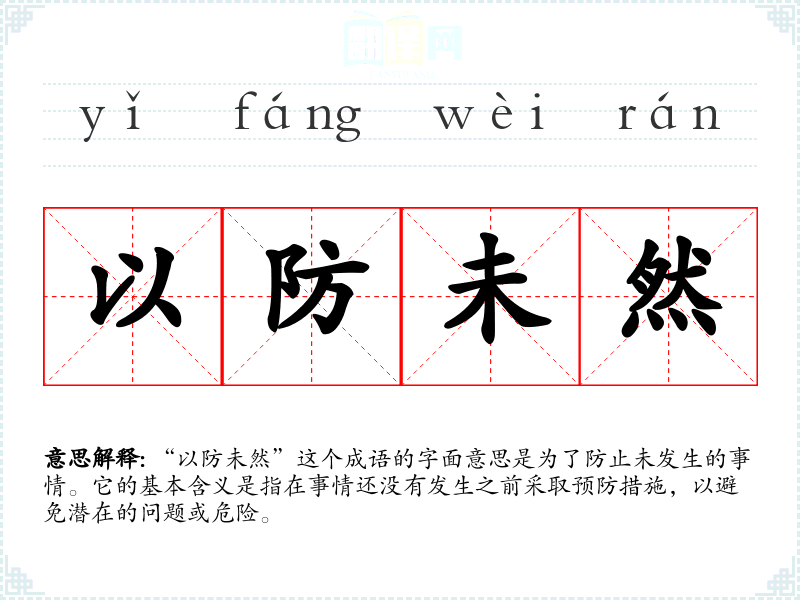 “以防未然”这个成语的字面意思是为了防止未发生的事情。它的基本含义是指在事情还没有发生之前采取预防措施,以避免潜在的问题或危险。