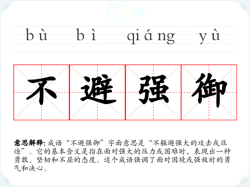 成语“不避强御”字面意思是“不躲避强大的攻击或压迫”。它的基本含义是指在面对强大的压力或困难时,表现出一种勇敢、坚韧和不屈的态度。这个成语强调了面对困境或强敌时的勇气和决心。