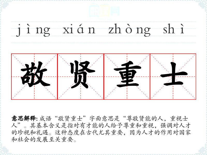 成语“敬贤重士”字面意思是“尊敬贤能的人,重视士人”。其基本含义是指对有才能的人给予尊重和重视,强调对人才的珍视和礼遇。这种态度在古代尤其重要,因为人才的作用对国家和社会的发展至关重要。
