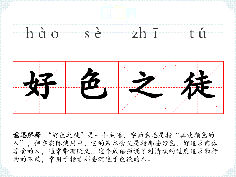 “好色之徒”是一个成语,字面意思是指“喜欢颜色的人”,但在实际使用中,它的基本含义是指那些好色、好追求肉体享受的人,通常带有贬义。这个成语强调了对情欲的过度追求和行为的不端,常用于指责那些沉迷于色欲的人。
