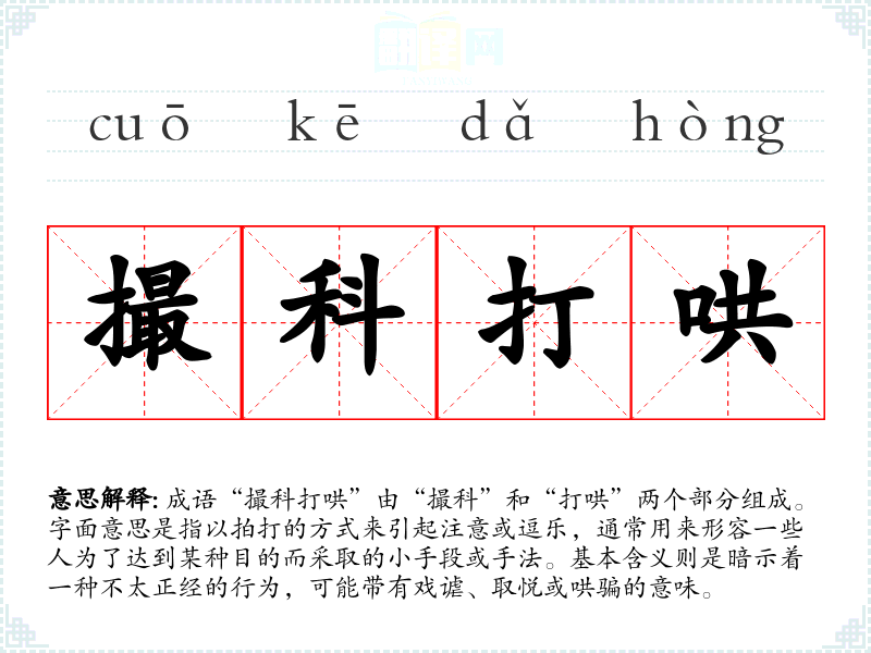 成语“撮科打哄”由“撮科”和“打哄”两个部分组成。字面意思是指以拍打的方式来引起注意或逗乐,通常用来形容一些人为了达到某种目的而采取的小手段或手法。基本含义则是暗示着一种不太正经的行为,可能带有戏谑、取悦或哄骗的意味。