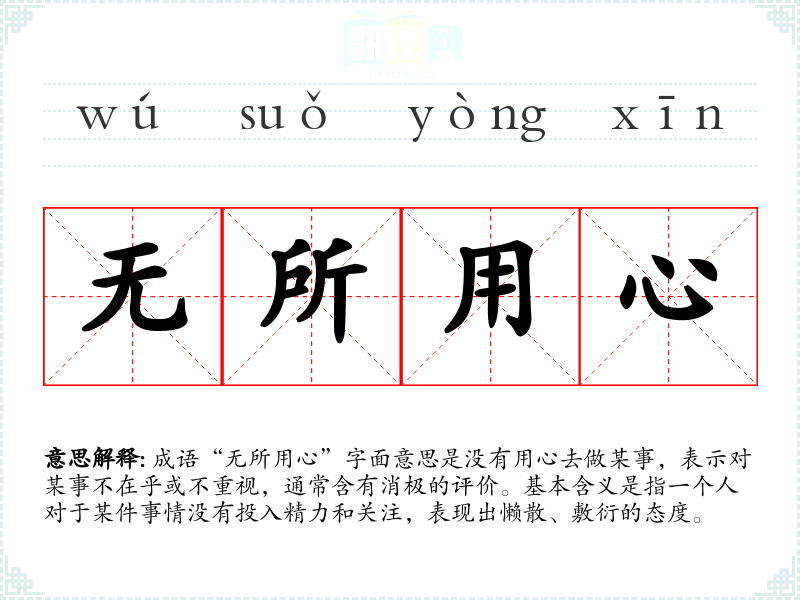 成语“无所用心”字面意思是没有用心去做某事,表示对某事不在乎或不重视,通常含有消极的评价。基本含义是指一个人对于某件事情没有投入精力和关注,表现出懒散、敷衍的态度。