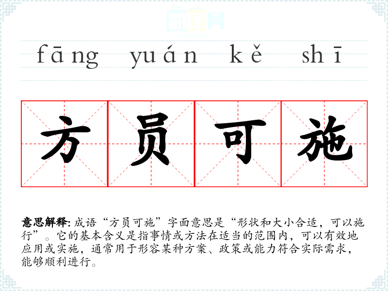 成语“方员可施”字面意思是“形状和大小合适,可以施行”。它的基本含义是指事情或方法在适当的范围内,可以有效地应用或实施,通常用于形容某种方案、政策或能力符合实际需求,能够顺利进行。