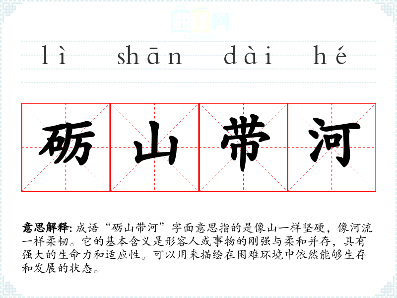 成语“砺山带河”字面意思指的是像山一样坚硬,像河流一样柔韧。它的基本含义是形容人或事物的刚强与柔和并存,具有强大的生命力和适应性。可以用来描绘在困难环境中依然能够生存和发展的状态。