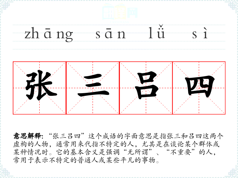“张三吕四”这个成语的字面意思是指张三和吕四这两个虚构的人物,通常用来代指不特定的人,尤其是在谈论某个群体或某种情况时。它的基本含义是强调“无所谓”、“不重要”的人,常用于表示不特定的普通人或某些平凡的事物。