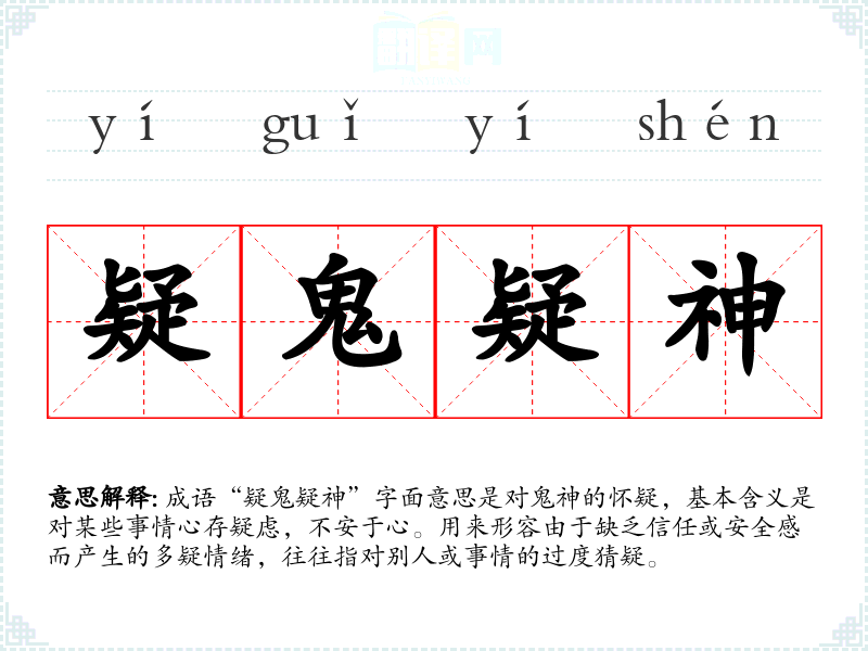 成语“疑鬼疑神”字面意思是对鬼神的怀疑,基本含义是对某些事情心存疑虑,不安于心。用来形容由于缺乏信任或安全感而产生的多疑情绪,往往指对别人或事情的过度猜疑。
