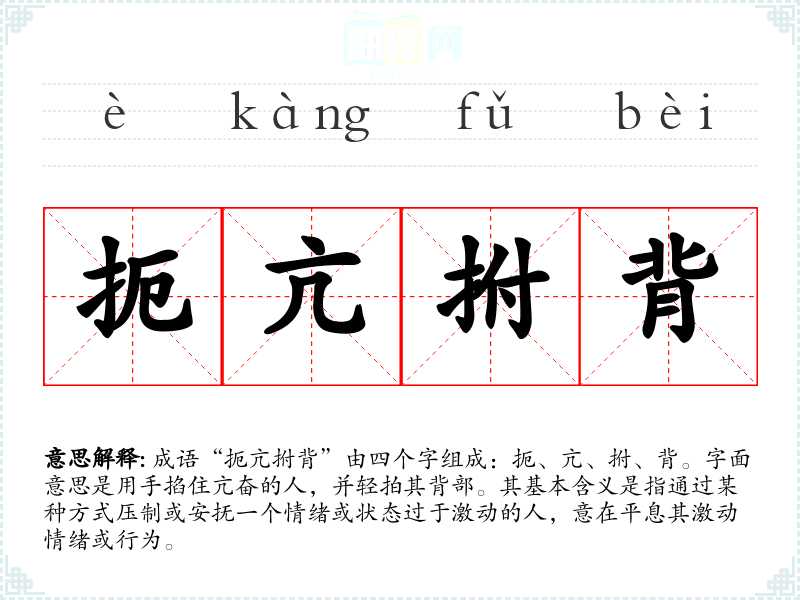 成语“扼亢拊背”由四个字组成:扼、亢、拊、背。字面意思是用手掐住亢奋的人,并轻拍其背部。其基本含义是指通过某种方式压制或安抚一个情绪或状态过于激动的人,意在平息其激动情绪或行为。