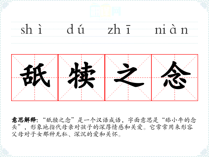 “舐犊之念”是一个汉语成语,字面意思是“舔小牛的念头”,形象地指代母亲对孩子的深厚情感和关爱。它常常用来形容父母对子女那种无私、深沉的爱和关怀。