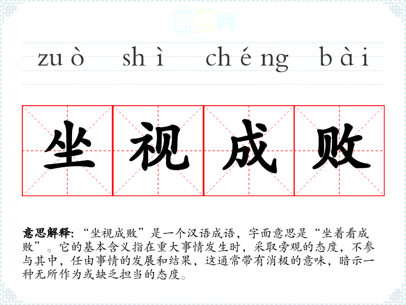 在英语中,有一个与“坐视成败”相似的表达是“to sit on the sidelines”,意指在某个**中不参与,只是旁观。这种表达同样带有负面的含义,强调了不参与的责任感缺失。