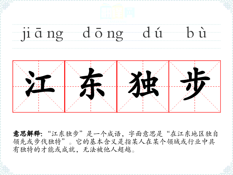 “江东独步”是一个成语,字面意思是“在江东地区独自领先或步伐独特”。它的基本含义是指某人在某个领域或行业中具有独特的才能或成就,无法被他人超越。
