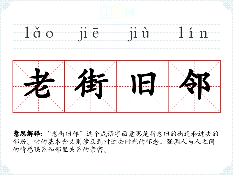 “老街旧邻”这个成语字面意思是指老旧的街道和过去的邻居。它的基本含义则涉及到对过去时光的怀念,强调人与人之间的情感联系和邻里关系的亲密。