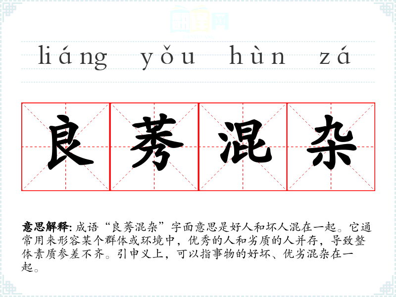 成语“良莠混杂”字面意思是好人和坏人混在一起。它通常用来形容某个群体或环境中,优秀的人和劣质的人并存,导致整体素质参差不齐。引申义上,可以指事物的好坏、优劣混杂在一起。