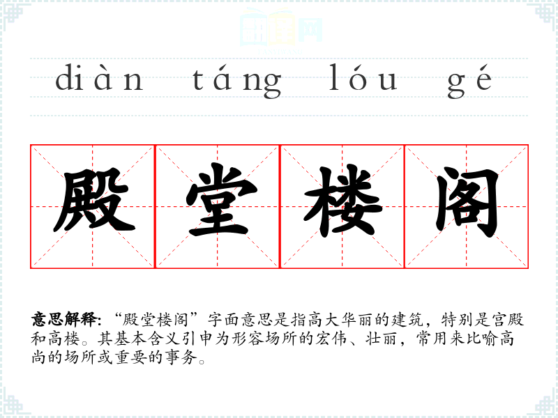“殿堂楼阁”字面意思是指高大华丽的建筑,特别是宫殿和高楼。其基本含义引申为形容场所的宏伟、壮丽,常用来比喻高尚的场所或重要的事务。