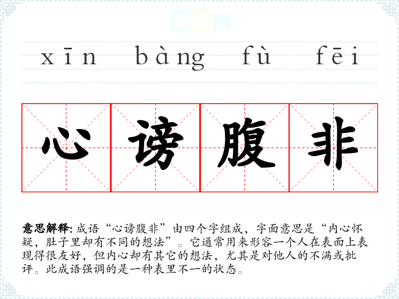 成语“心谤腹非”由四个字组成,字面意思是“内心怀疑,肚子里却有不同的想法”。它通常用来形容一个人在表面上表现得很友好,但内心却有其它的想法,尤其是对他人的不满或批评。此成语强调的是一种表里不一的状态。