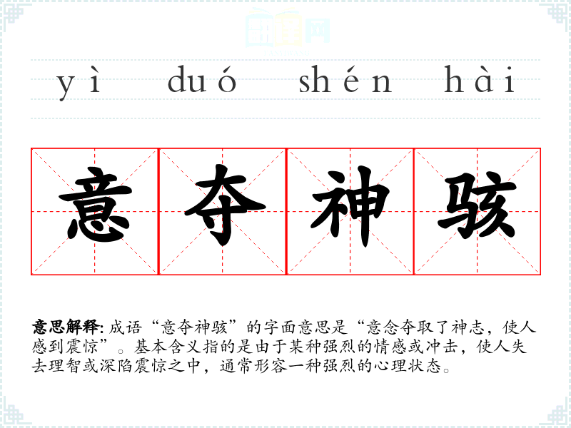 成语“意夺神骇”的字面意思是“意念夺取了神志,使人感到震惊”。基本含义指的是由于某种强烈的情感或冲击,使人失去理智或深陷震惊之中,通常形容一种强烈的心理状态。