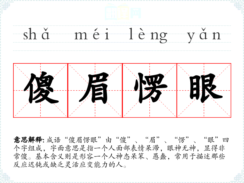 成语“傻眉愣眼”由“傻”、“眉”、“愣”、“眼”四个字组成,字面意思是指一个人面部表情呆滞,眼神无神,显得非常傻。基本含义则是形容一个人神态呆笨、愚蠢,常用于描述那些反应迟钝或缺乏灵活应变能力的人。