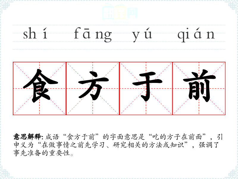 成语“食方于前”的字面意思是“吃的方子在前面”,引申义为“在做事情之前先学*、研究相关的方法或知识”,强调了事先准备的重要性。