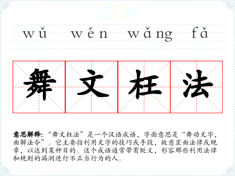 “舞文枉法”是一个汉语成语,字面意思是“舞动文字,曲解法令”。它主要指利用文字的技巧或手段,故意歪曲法律或规章,以达到某种目的。这个成语通常带有贬义,形容那些利用法律和规则的漏洞进行不正当行为的人。