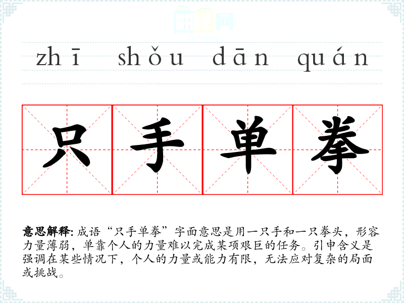 成语“只手单拳”字面意思是用一只手和一只拳头,形容力量*弱,单靠个人的力量难以完成某项艰巨的任务。引申含义是强调在某些情况下,个人的力量或能力有限,无法应对复杂的局面或挑战。