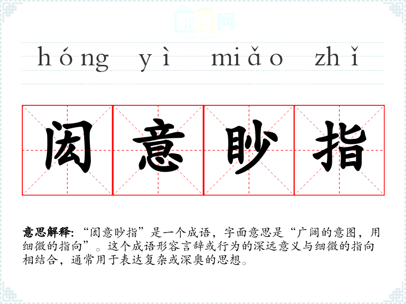 “闳意眇指”源于古代文献,尤其是在描述哲学或文学作品时,常用来强调某种思想的宏伟与微妙。具体的历史背景则较为模糊,但可以推测与传统的儒家思想以及对语言表达的重视有关。