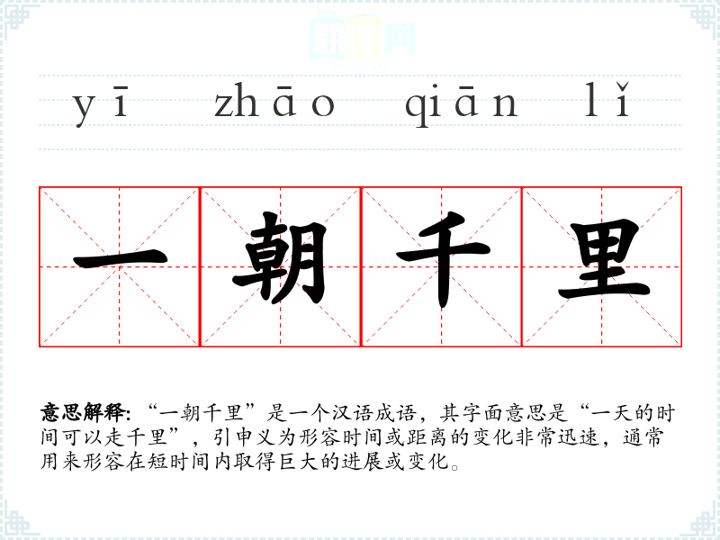 “一朝千里”是一个汉语成语,其字面意思是“一天的时间可以走千里”,引申义为形容时间或距离的变化非常迅速,通常用来形容在短时间内取得巨大的进展或变化。