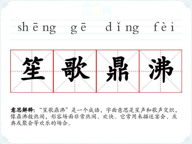 “笙歌鼎沸”是一个成语,字面意思是笙声和歌声交织,像鼎沸般热闹,形容场面非常热闹、欢快。它常用来描述宴会、庆典或聚会等欢乐的场合。