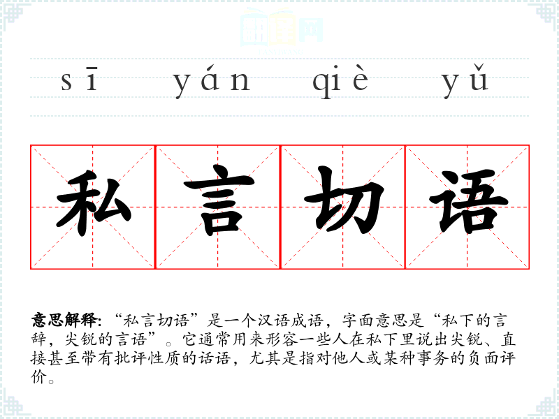 “私言切语”是一个汉语成语,字面意思是“私下的言辞,尖锐的言语”。它通常用来形容一些人在私下里说出尖锐、直接甚至带有批评性质的话语,尤其是指对他人或某种事务的负面评价。
