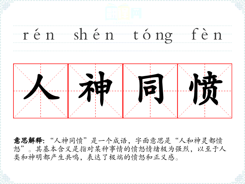 | 人神同愤 | 人和神都愤恨。形容民愤极大。 |