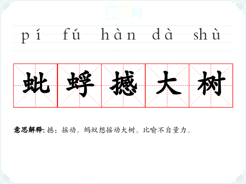 撼:摇动。蚂蚁想摇动大树。比喻不自量力。 |